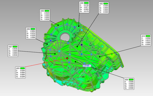 快速準確地獲取了汽車變速箱殼體的3D偏差數據,準確高效地找到變速箱殼體的誤差,根本上保證了變速箱殼體的生產質量安全。同時大大簡化汽車制造業零部件的生產質量把控難度,提高檢測的效率,獲得客戶的認可和好評;另一方面,獲取高精度的三維數據讓只有合格的變速箱殼體才能裝配進入汽車,大大保證汽車駕駛工作環境的安全性,為駕駛者保駕護航!